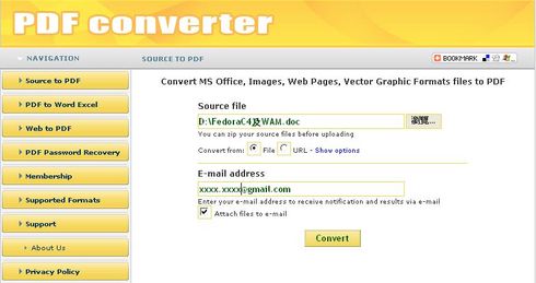 這個網站不是pdf軟體,是線上提供pdf服務的站台,在上面的紅框中選擇你要轉檔的來源,然後輸入你的E-mail address,按下Convert後,它就會開始轉檔的運算,如果檔案大,就會花多一點的時間,檔案小也是一下子就轉好了,一點都不輸安裝的pdf軟體。 |